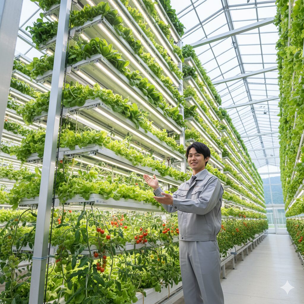 - 垂直農法(バーティカルファーミング):棚を多段に設置し、各層で葉物野菜などを栽培する方法です。主に室内で行われ、LED照明や水耕栽培を組み合わせることで、土地面積の何倍もの栽培面積を確保できます。